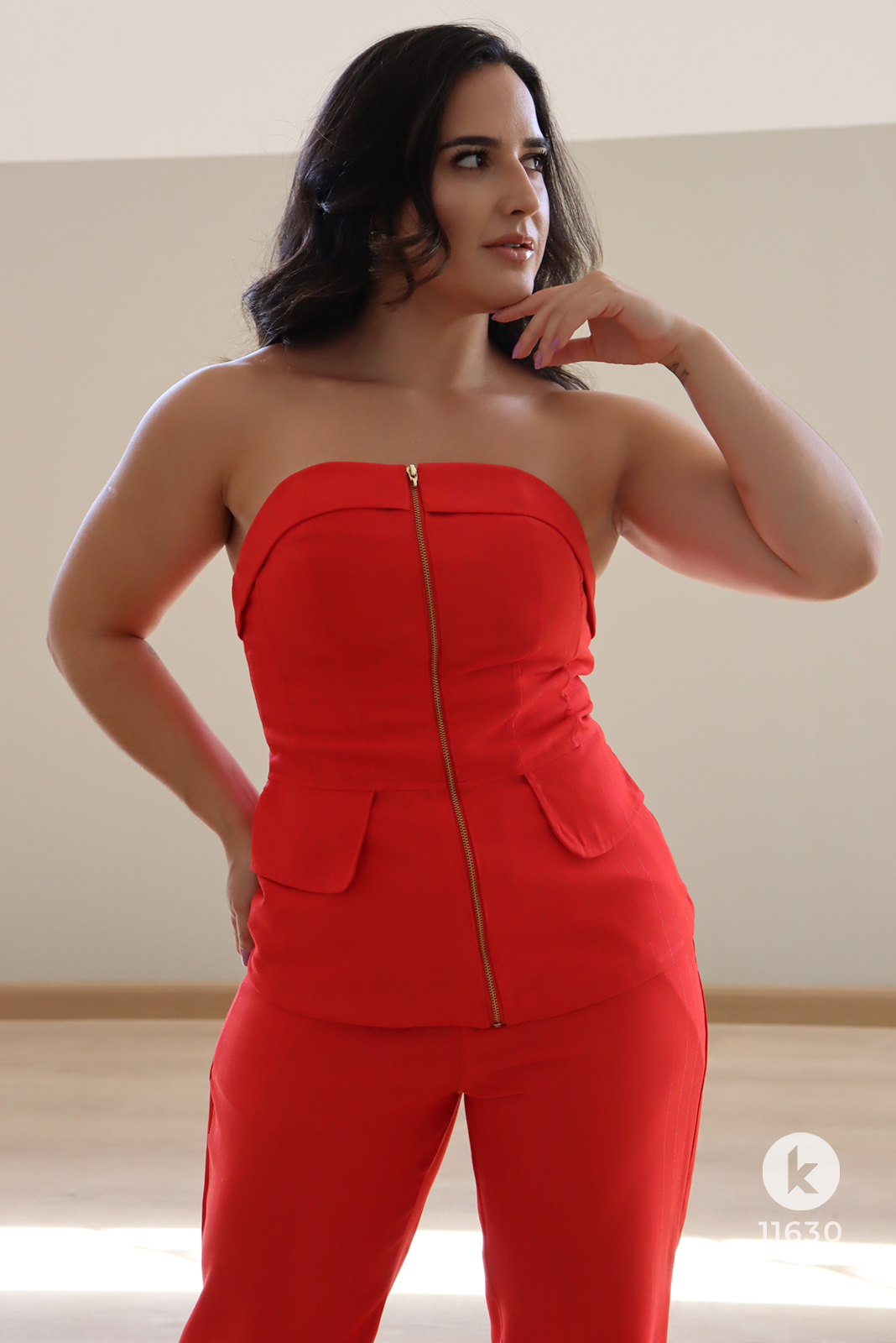 CONJUNTO ALAFAITARIA VERMELHO, BLUSA COM ZIPER FRONTAL E ALÇA REMOVÍVEL PODENDO SER USADA TOMARA QUE CAIA , CALÇA ALFAIATARIA COM BOLSO FACA E CAIMENTO IMPECAVEL
